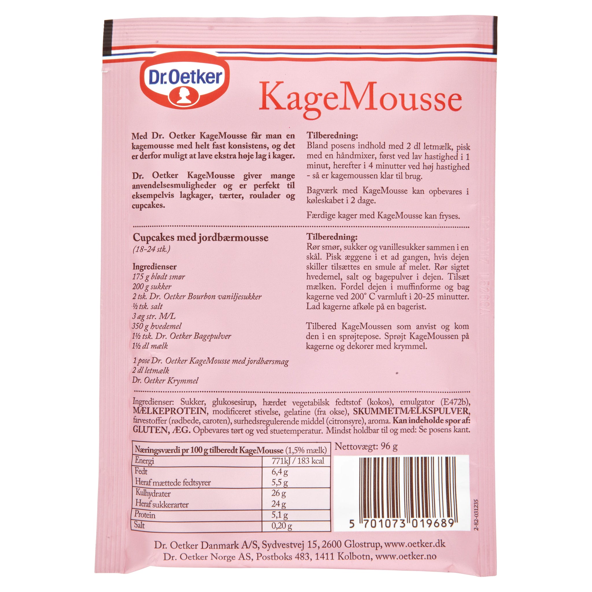 Kagemousse med jordbærsmag fra Dr. Oetker har en fast og luftig konsistens, som gør det muligt at lave ekstra høje lag i dine kager.